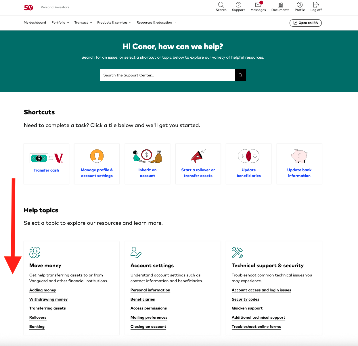 - From the support page, scroll all the way down to the "Investment products & services" section
