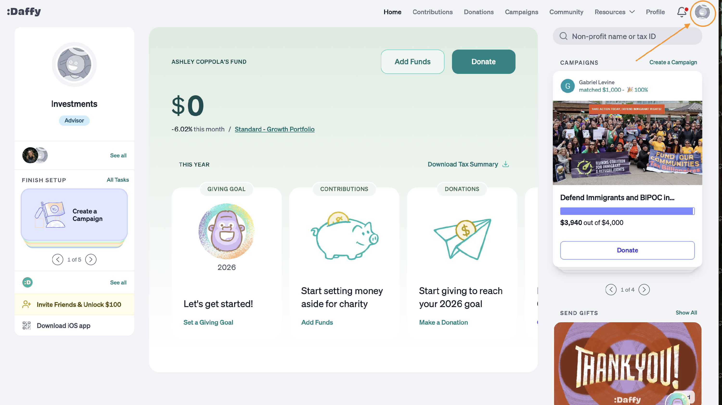 Please go to https://www.daffy.org/ to setup your account if you have not already. Once you set up your account or if you already have one, share your Fund account number via the open task in your client portal.